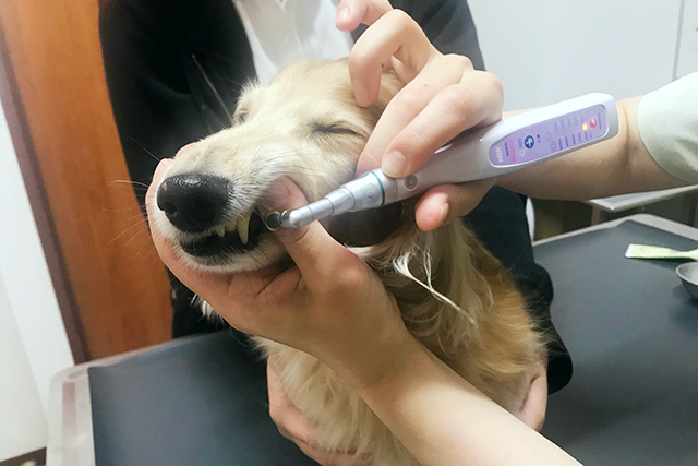 獣医師による無麻酔歯石除去(犬のみ)を実施しております。麻酔のリスクがないため定期ケアが可能です。その子に合ったデンタルケアを行います。
